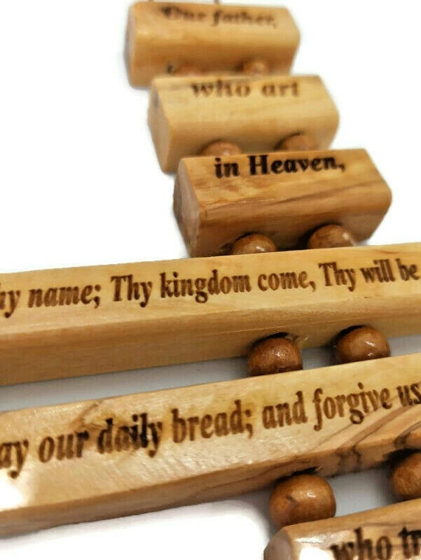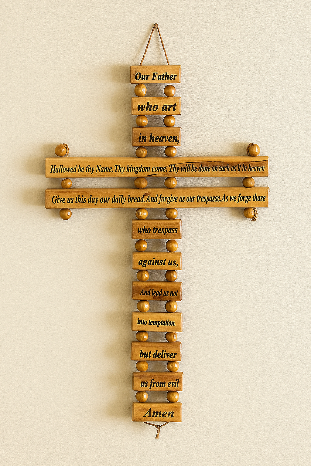 Bring a piece of the Holy Land into your home with this beautifully handcrafted Olive Wood Cross. Each cross is carefully made from genuine olive wood, featuring the full text of the Lord’s Prayer engraved on horizontal slats, connected with wooden beads to form the traditional cross shape.