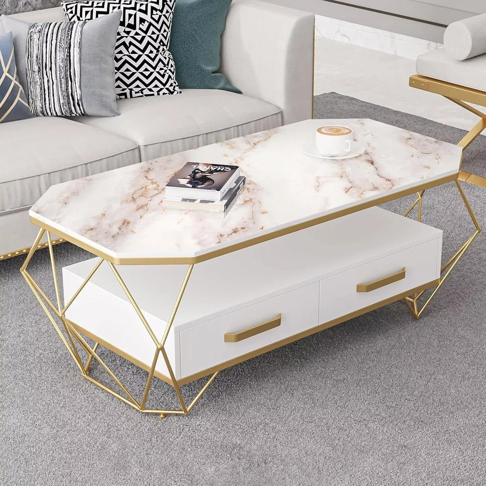 The Peel & Stick Gold Marble Contact Paper is a modern and stylish self-adhesive wallpaper designed for easy application in various rooms like the bathroom, kitchen, or bedroom. The marbled pattern in white and gold colors adds a touch of elegance to any space. The vinyl coated finish makes it waterproof and durable for use on countertops, measuring 116" in length and 23.5" in width. This contact paper comes in a roll packaging and covers approximately 19.7 square feet, featuring a peelable removal type for convenience.