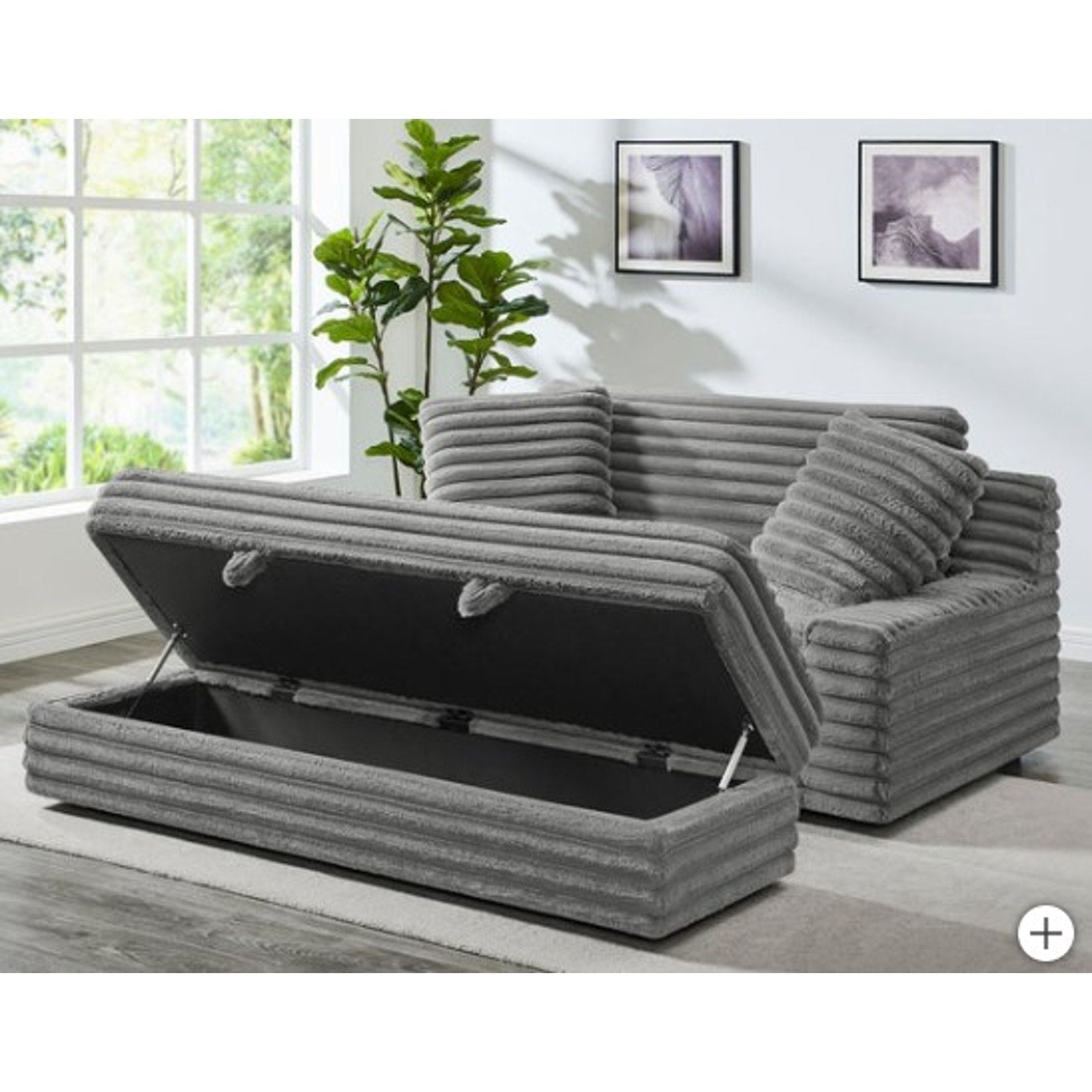 Selling a Thomasville Wills Fabric Oversize Chair and Storage Ottoman. This ultra-soft, wide corduroy chair offers a comfortable lounging experience and includes a matching storage ottoman.